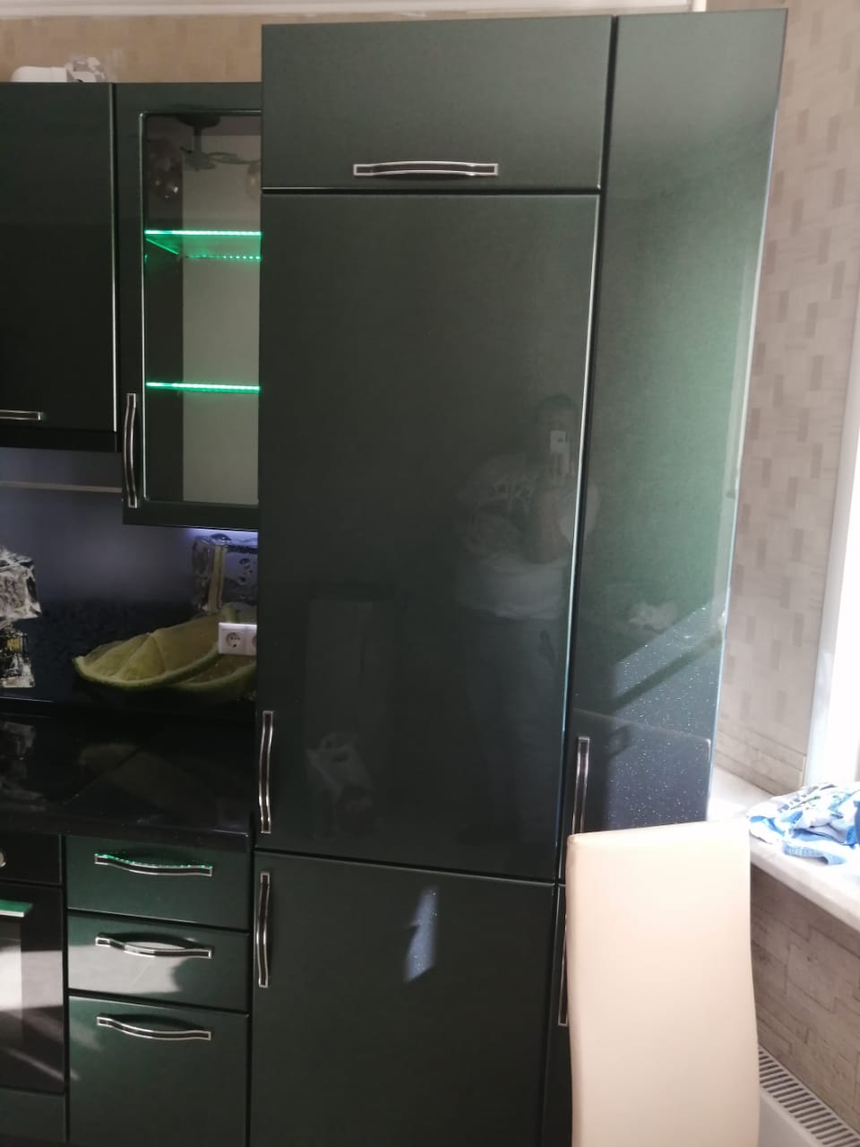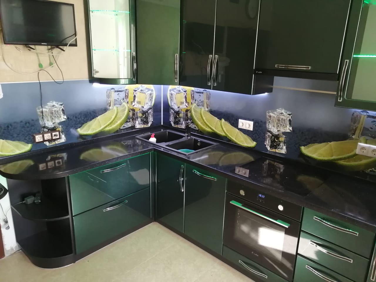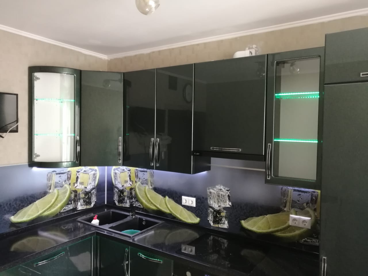 Стиль и гламур: темно-зеленый глянцевый угловой кухонный гарнитур