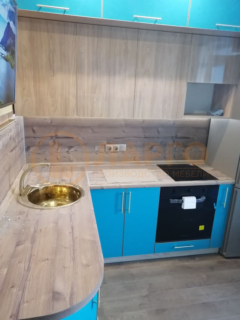 Декор под натуральное дерево делает интерьер тёплым и гармоничным, а фасады насыщенного цвета морской волны добавляют свежести и динамики.